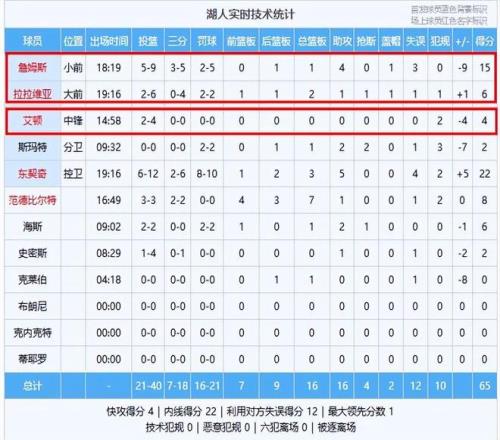 整個上半場湖人持續(xù)被活塞壓制,主要是籃下護(hù)框,攻防轉(zhuǎn)換,以及空位三分把握不好!從數(shù)據(jù)角度來看,半場落后有三大罪人!第一罪人就是艾頓,半場僅僅只有4分0籃板0助攻0搶斷0蓋帽的數(shù)據(jù),面對活塞強(qiáng)硬的身體對抗完全不敢站內(nèi)線,護(hù)框更是不用說了,落后頭號罪人!第二罪人就是拉拉維亞,湖人絕大多數(shù)空位季后都在他手里,各種大空位三分不中,三分線外4中0發(fā)揮太差了。第三罪人就是詹姆斯,進(jìn)攻端問題不大,問題就是出在防守端,作為大前鋒完全不護(hù)框,無數(shù)次目送活塞球員上籃,正負(fù)值又一次全場最低!