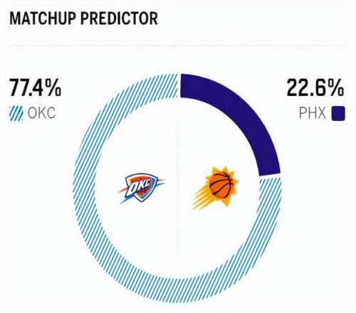 賽前,美媒ESPN對(duì)本場(chǎng)比賽進(jìn)行了勝率預(yù)測(cè),雷霆?jiǎng)俾矢哌_(dá)77.4%, 太陽隊(duì)勝率則意外達(dá)到了22.6%,算是近期對(duì)陣?yán)做獎(jiǎng)俾瘦^高的一支球隊(duì)了。